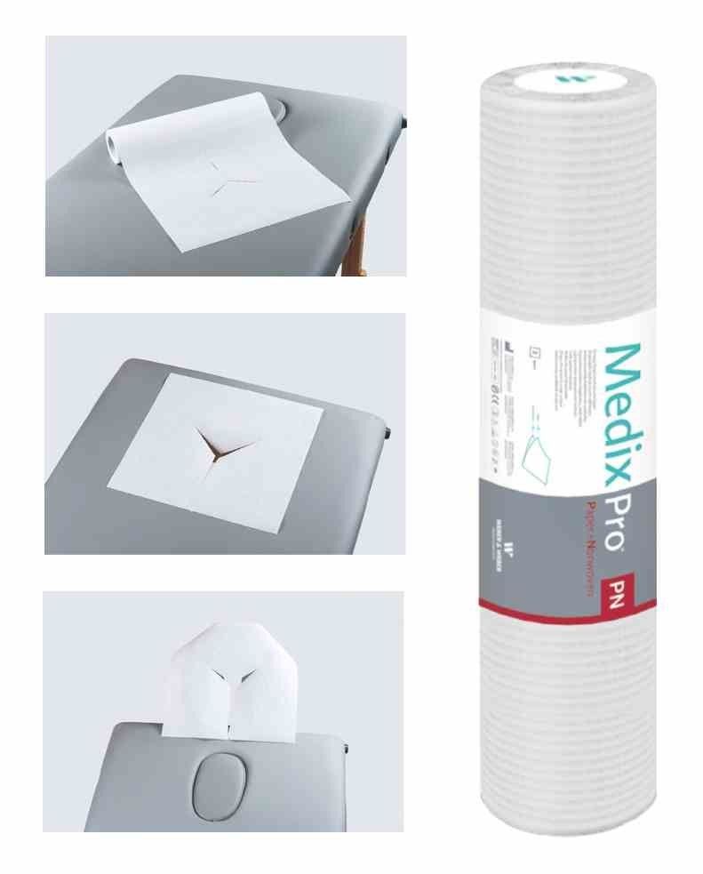 Einweg-Gesichtsschutzunterlage auf Rolle weiss, aus Papier & Vliesstoff mit Y-Schnitt für Gesicht, 33cm x 31cm, 50 Stk. pro Rolle